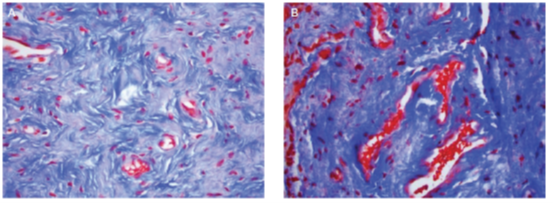 (B) Em 8 meses após o tratamento, depósitos de colágeno (observados com coloração tricrômica) apareceram mais proeminente após o tratamento.