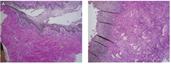 (B) Após 8 meses de tratamento, os achados histológicos mostraram aumento da vascularização submucosa, bem como aumento dos depósitos de colágeno e fibras elásticas.